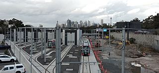 Description: Lilyfield light rail maintenance centre, situated on the site of the Rozelle Rail Yards, in 2019. The depot was built for the CBD&SE light rail. A junction west of Lilyfield station connects it to the Dulwich Hill Line.
