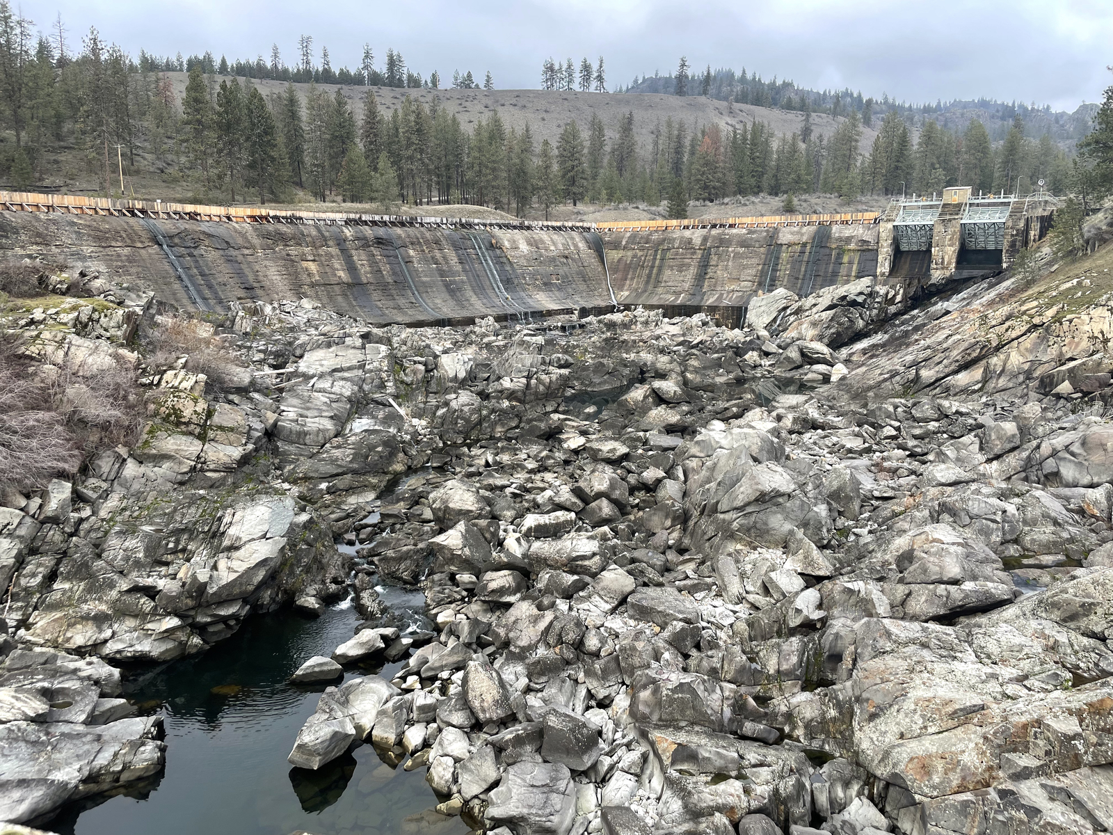 Description: The dam at the Little Falls Hydroelectric Power Plant on the Spokane River looking upstream in January 2024. View is from an abandoned bridge connecting the Lincoln County (near) and Stevens County (far) sides of the facility.