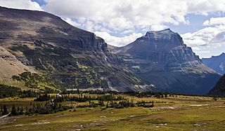 Description: View of Logan Pass, with the Logan Pass visitor center in middle distance, the Going-to-the-Sun Road beyond and Going-to-the-Sun Mountain, in Glacier National Park, Montana, USA
