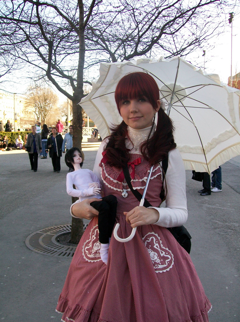 Description: Woman dressed in sweet lolita fashion holding a ball-jointed doll.