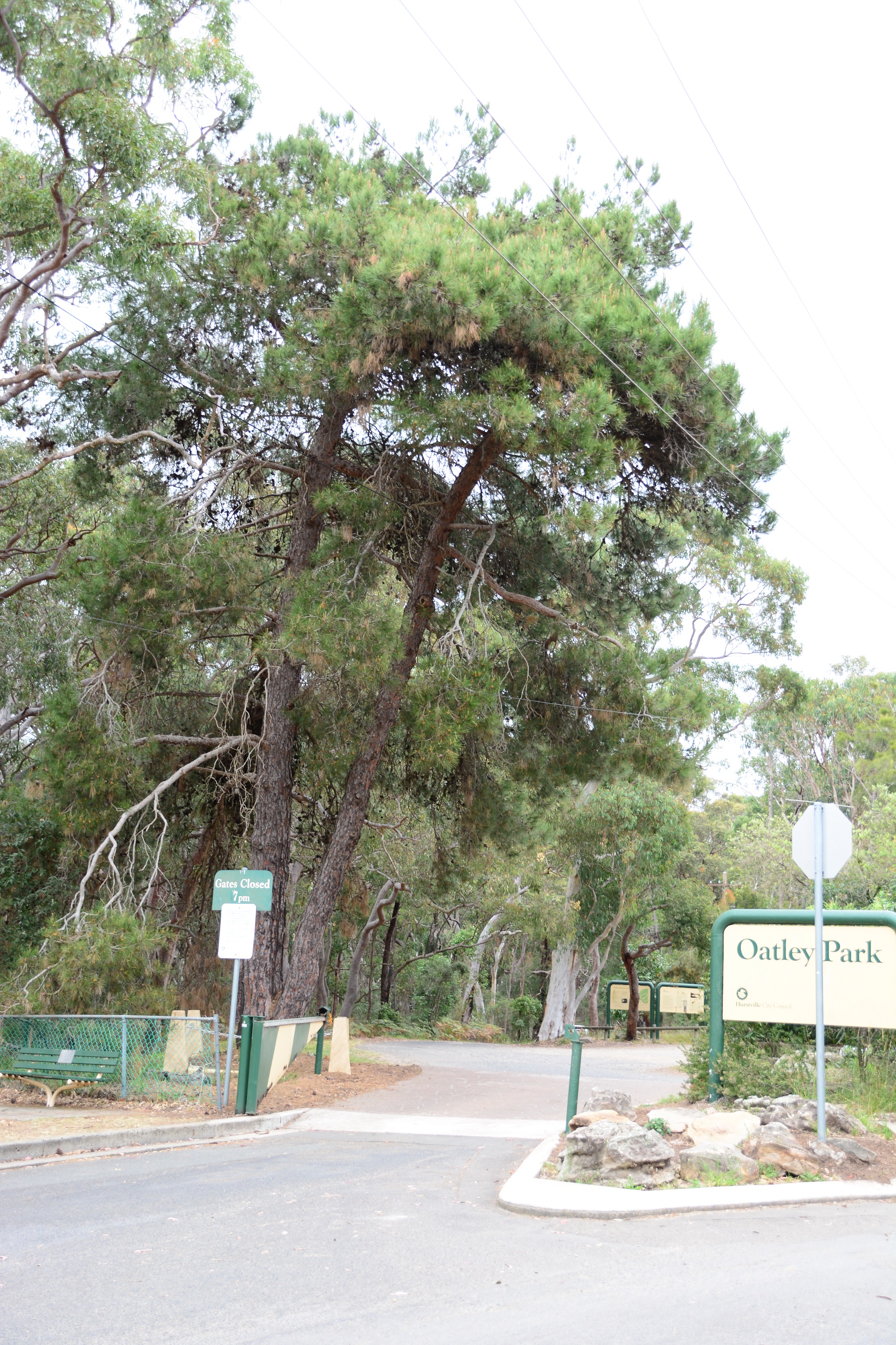 Description: According to plaques at its base, this pine tree at the Oatley Park Avenue entrance to Oatley Park, NSW, was grown from pine cones taken from Lone Pine, Gallipoli.