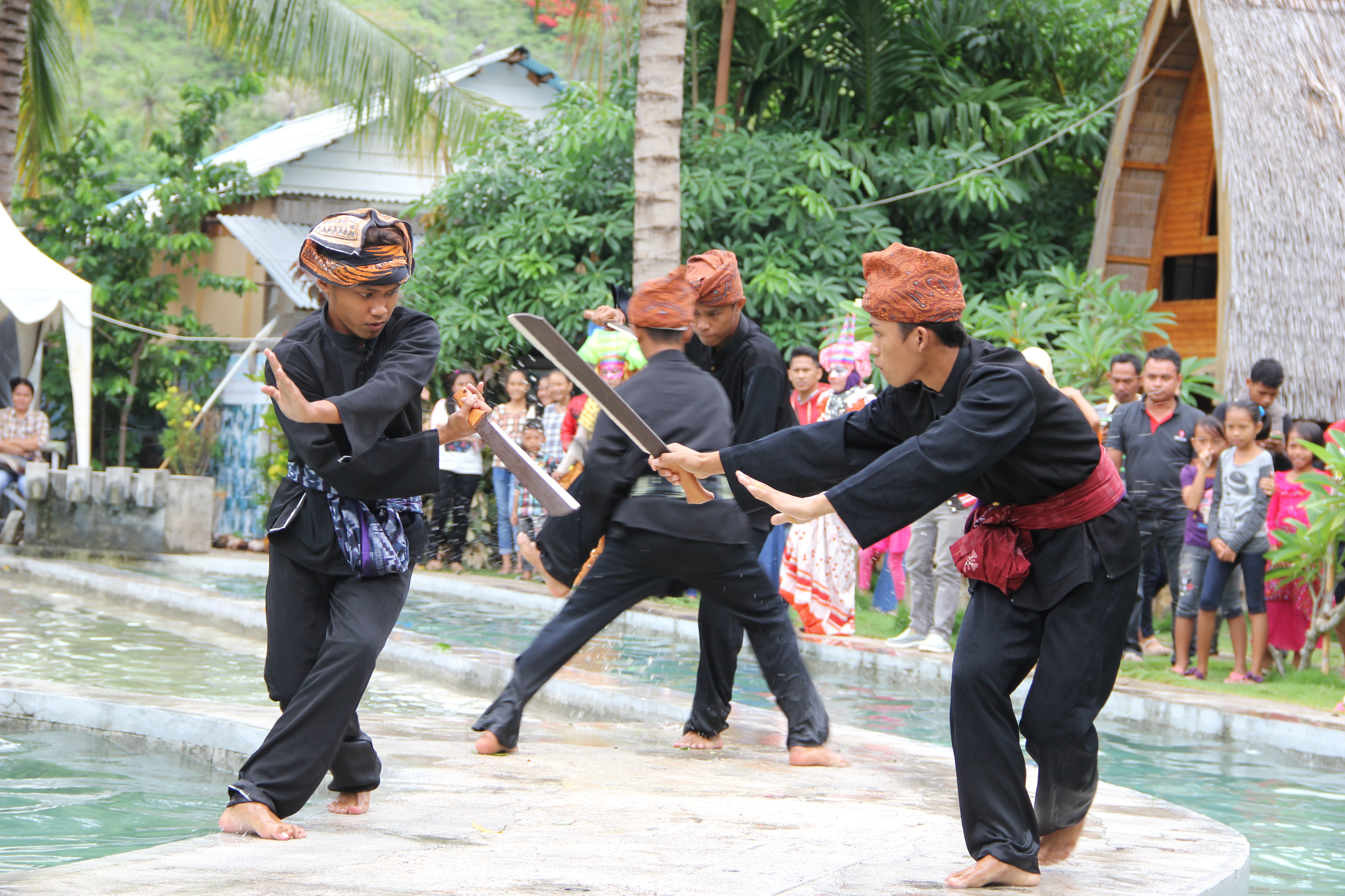 Description: A group of young people playing longgo. Longgo is the traditional martial arts of Gorontalo people who use sword weapons.