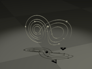 Description: Finite segment of a trajectory of Lorenz's equations, computed by numerical integration and rendered as a metal wire. Parameter values are classical. Conical beads indicate the direction of travel. The black hemisphere marks the origin, and directions of the x and y axes are as indicated. The base of each axis triangle is 20 units from the origin. The z axis points upward; the highest point on the wire is approximately 45 units above the x-y plane. The shadow is cast by a spotlight high on the z axis. Adapted from an image I produced for my Ph.D. thesis. Numerical integration is explicit Euler. The scene was rendered using POV-RAY.