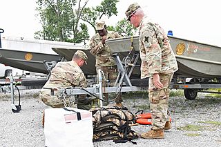 Description: Soldiers with the 769th Brigade Engineer Battalion conduct inspections and test high-water vehicles, flat bottom boats and boating equipment in preparation for the state activation in support of Tropical Storm Barry, July 10, 2019, at the Armed Forces Reserve Center, Baton Rouge, La. Louisiana's Guardsmen are trained, ready and equipped to stand up at any moment to protect lives and property, maintain communications, and ensure the continuity of operations and government. (U.S. Air National Guard photo by Master Sgt. Toby M. Valadie)