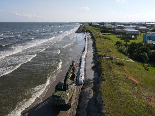 Description: Louisiana National Guard Soldiers with the 843rd Engineer Company work around the clock to assist local and state agencies to reinforce exposed burrito levee in Grand Isle in preparation for Tropical Storms Marco and Laura. (Photo courtesy of 225th Engineer Brigade)