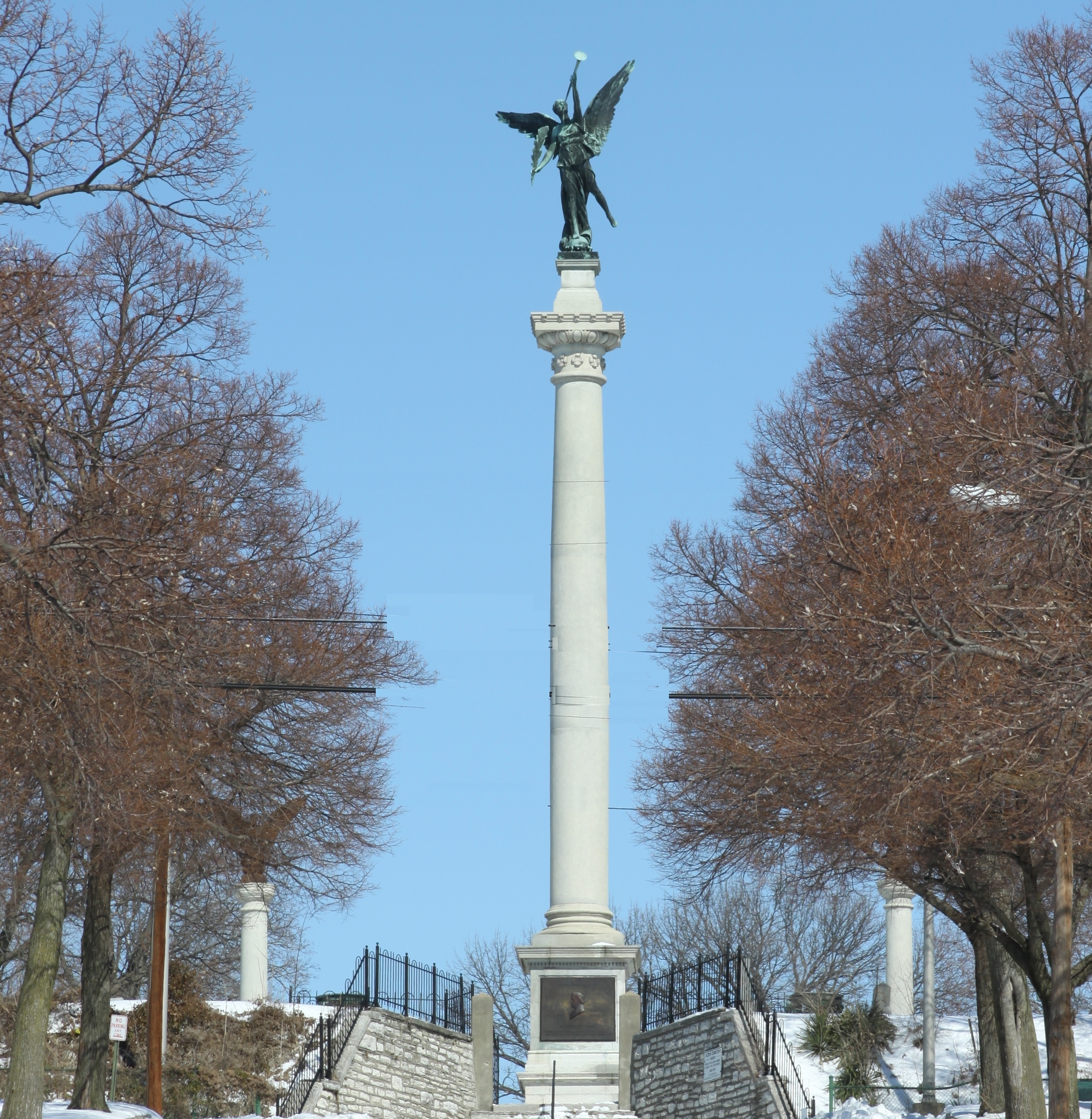 Description: Lovejoy Monument looking up from Monument Avenue in Alton Illinois. This photo was graphically enhanced to remove the power lines.