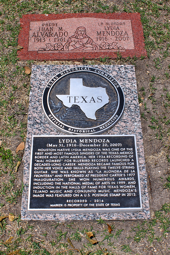 Description: Lydia Mendoza grave headstone and historical marker at San Fernando Cemetery #2, block 1B, San Antonio, Texas, United States.