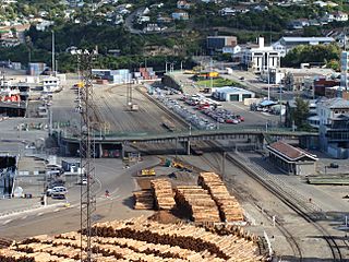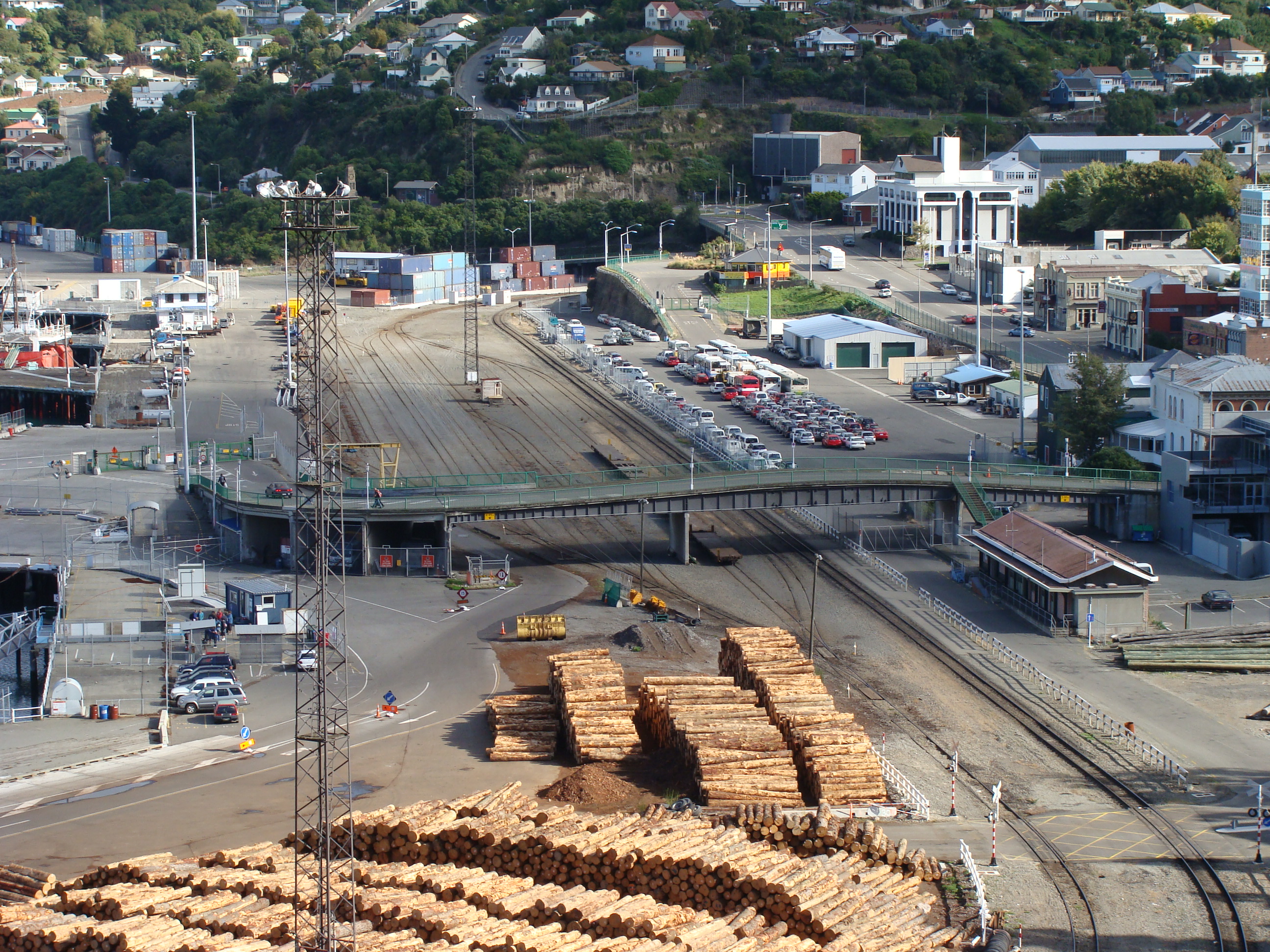 Description: Lyttelton railway station yard. Features of interest include the Oxford Street overbridge (middle), Lyttelton station building (right, in front of the bridge), shore-end of wharves 2 and 3 (left, opposite the end of the bridge), Lyttelton rail tunnel portal (obscured, centre background), and Lyttelton road tunnel portal (centre-right background). Also shown are two of the ports main sources of traffic: timber and motor vehicles.