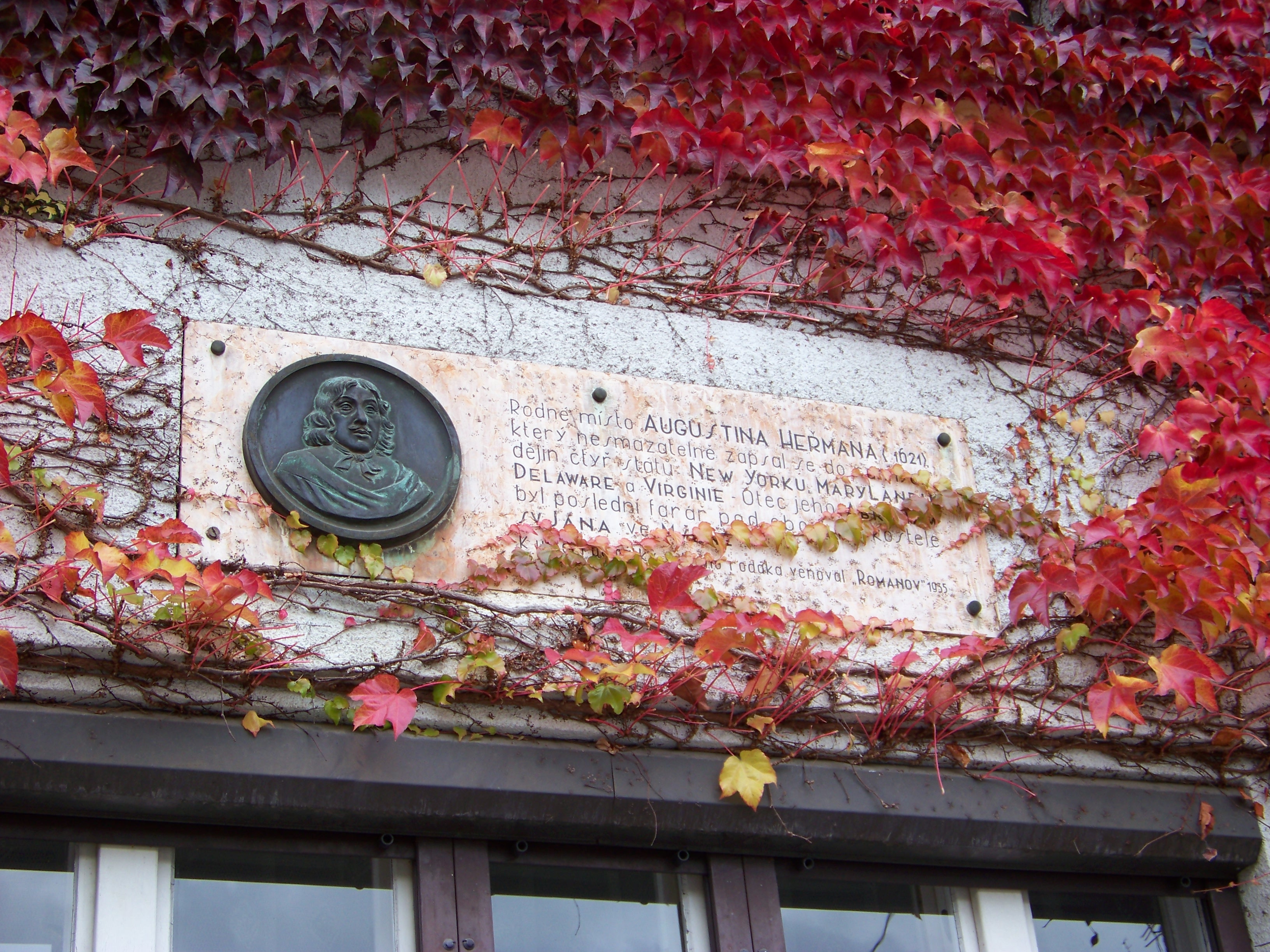 Description: Mšeno, Mělník District, Central Bohemian Region, the Czech Republic. Cinibulkova street, a plaque to Augustine Herman (1621).