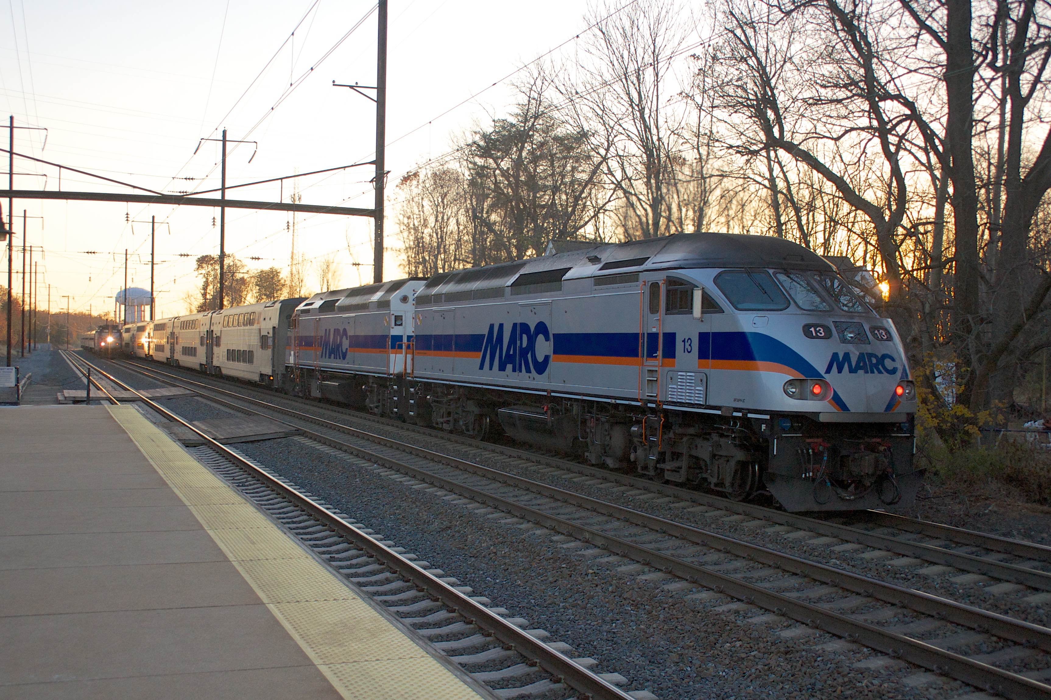 Description: A MARC Penn Line train pulls away from Odenton station as a Northeast Regional is about to pass on the center track