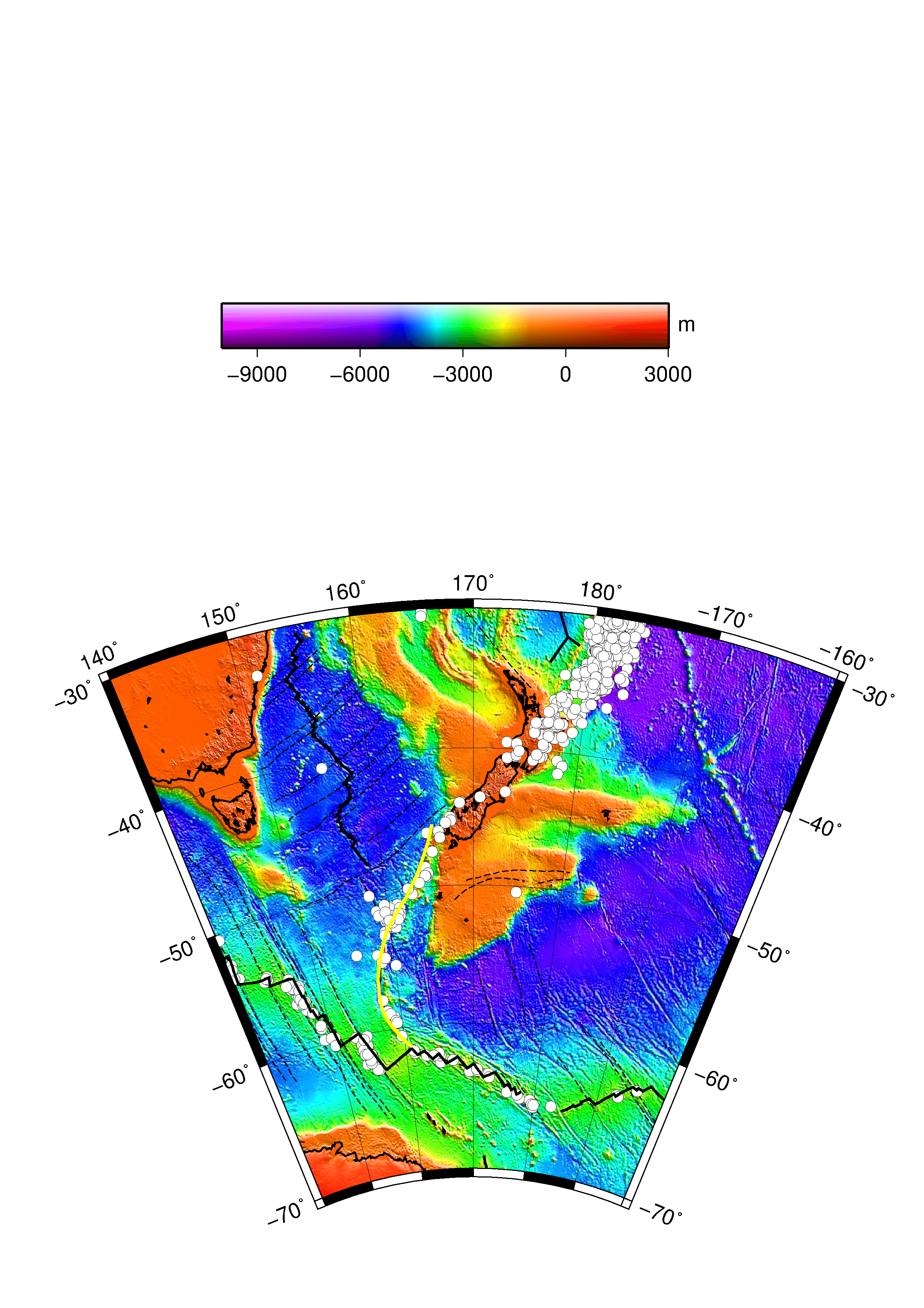 Description: Macquarie Fault Zone (yellow line) with earthquake epicenters (white circles). GMT, lambert projection