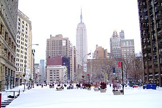 Description: Madison Square after the blizzard of 26-27 December 2010, as seen from 22nd Street and Broadway in the Flatiron District of Manhattan, New York City. The Flatiron Building is on the left, and the Madison Green apartment building on the right. In the midground, Madison Square Park is in the right, with Madison Square itself on the left, and the Toy Center Building on the far left. In the background is the Empire State Building.