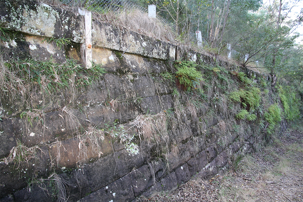 Description: Stonework supporting northern approach road, Maldon Suspension Bridge, NSW, Australia