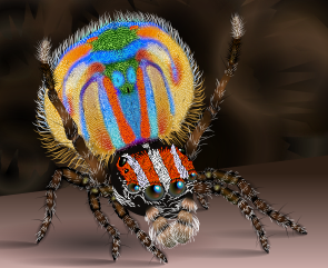 Description: SVG version of earlier JPG image of a male peacock spider (sp. Maratus volans) in a courtship pose. (Note that the PNG as well as the original SVG versions of this image will not render correctly in Firefox 30.0 or earlier for reasons given in Mozilla's Bugzilla report #376027).