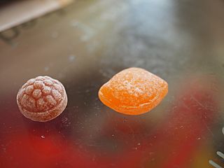 Description: Two fruit-flavoured candies containing strong chili extract, from the "Manalan makeiset" ("Candy from Hell") candy bag by the Finnish food company Poppamies.