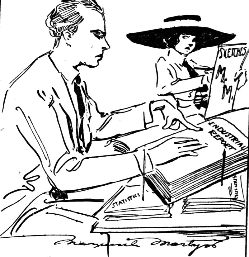 Description: Marguerite Martyn draws herself interviewing City Commissioner Guilford Glynn of Iola, Kansas, in 1911
