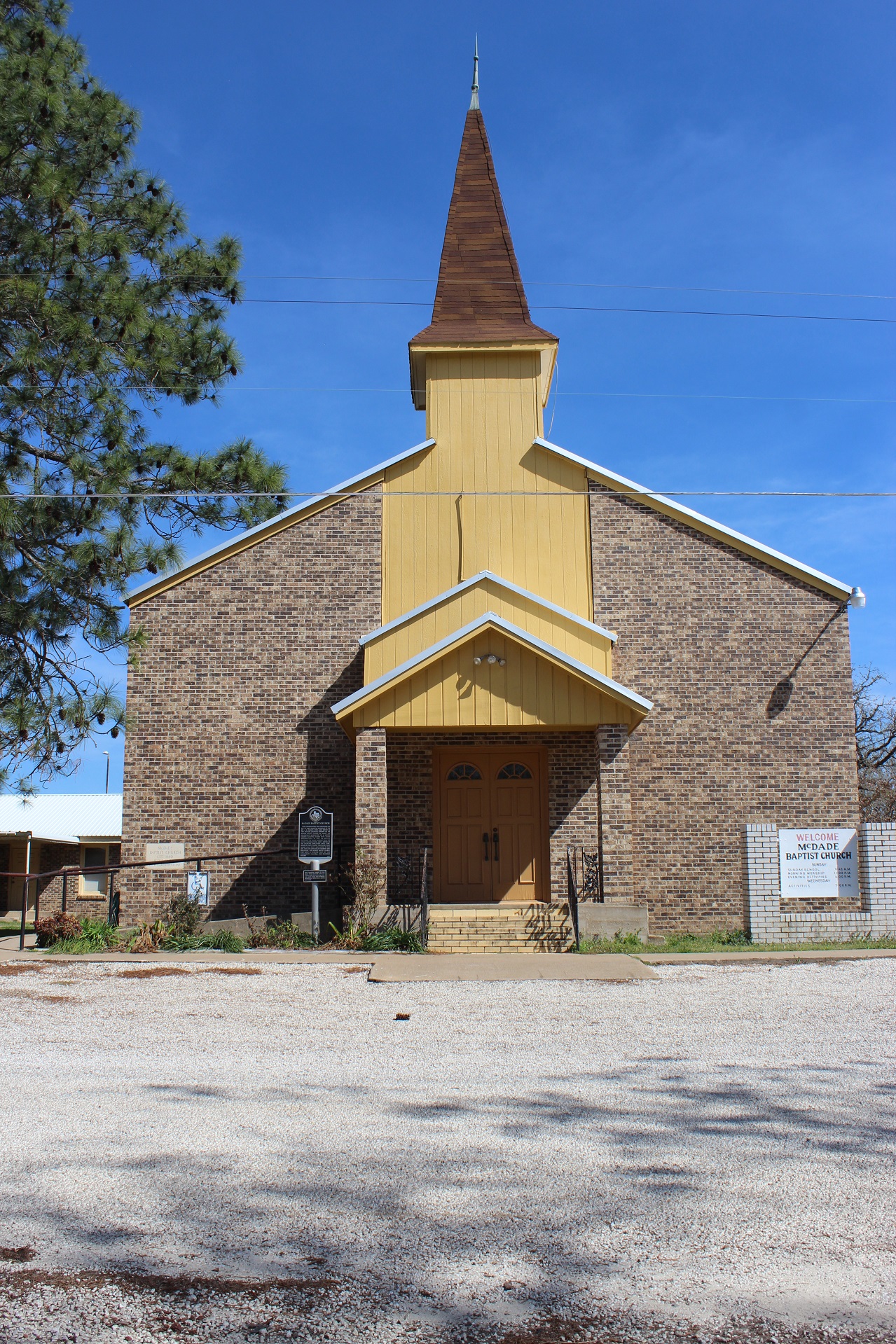 Description: McDade Baptist Church. McDade Baptist Church This congregation was organized on July 18, 1880, under the leadership of the Rev. J. D. Wright, who also served as first pastor. Originally known as the McDade Baptist Church of Christ, the fellowship worshiped in a union church building shared with other denominations. In 1900, the Baptists purchased the Union Building from the other congregations, and it served as the church's sanctuary until 1948, when an army chapel, purchased from nearby Camp Swift, was moved to this site. With an emphasis on worship and education, the McDade Baptist church has been a strong part of the community's cultural and religious history. (2002) #12936