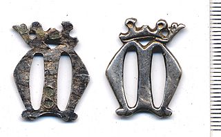 Description: A medieval badge in the form of a crowned, Lombardic letter "M". Badges if this type were commonly produced in base metal in the 14th and 15th centuries to signify devotion to the Virgin Mary. This example is silver and dates from the C15 (Brian Spencer, Pilgrim Souvenirs and Secular badges, Museum of London 1998, pp 155-157). The back is rather roughly finished and has 3 small round scars from the fitting. One is behind the centre of the crown & the others are behind the bottom of the centre bar of the M