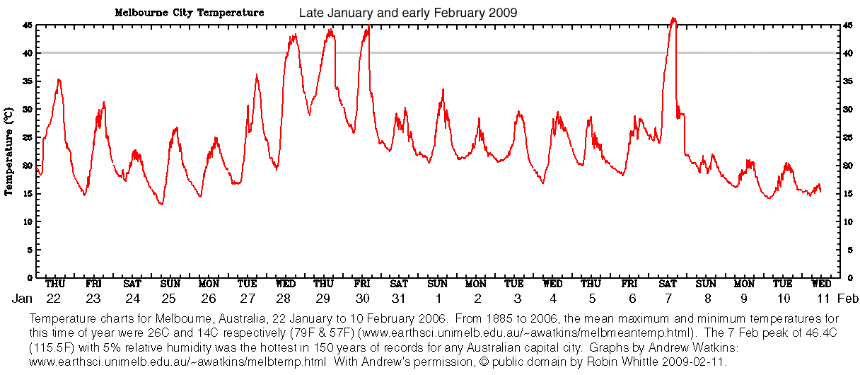 Description: This is a 20 day graph of air temperature measured at the Melbourne, Australia weather station of the Bureau of Meteorology. The days are 2009-01-22 to 2009-02-10, including four days above 43°C. There was intense bushfire activity on these days, with the 7 February record of 46.4°C being the day of the most deadly fires in Australia's history. I also have also uploaded a larger image melbourne-temp-2009-02-10.png showing each day in greater detail. These images are based on the charts created by Andrew Watkins http://www.earthsci.unimelb.edu.au/~awatkins/melbtemp.html . I have his permission to use his images for this purpose and to upload the resulting images to commons.wikimedia.org, with a public domain licence. I will be sending the messages as soon as I have uploaded the images.