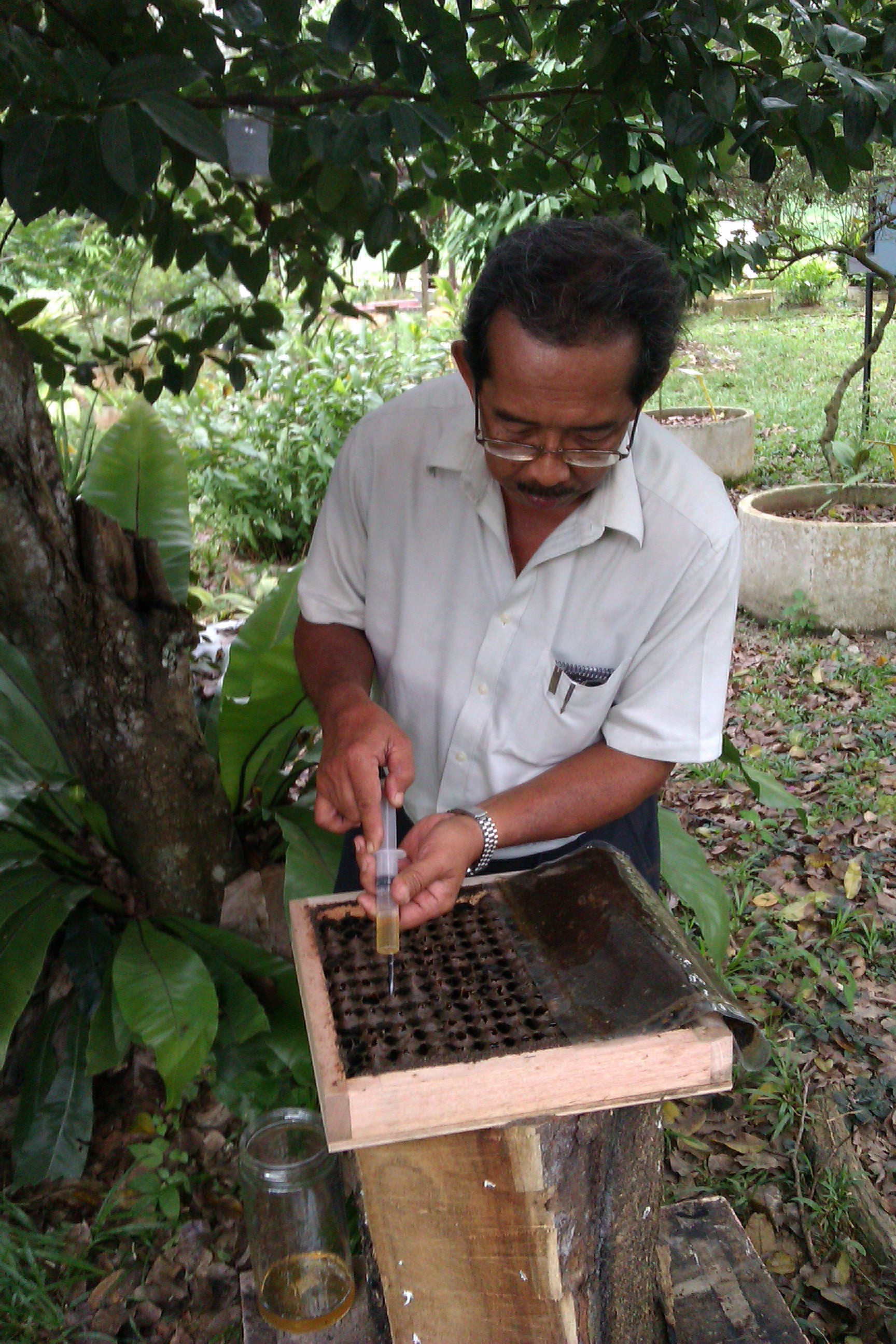 Description: Pemelihara lebah kelulut sedang memungut madu kelulut dari koloni kelulut.