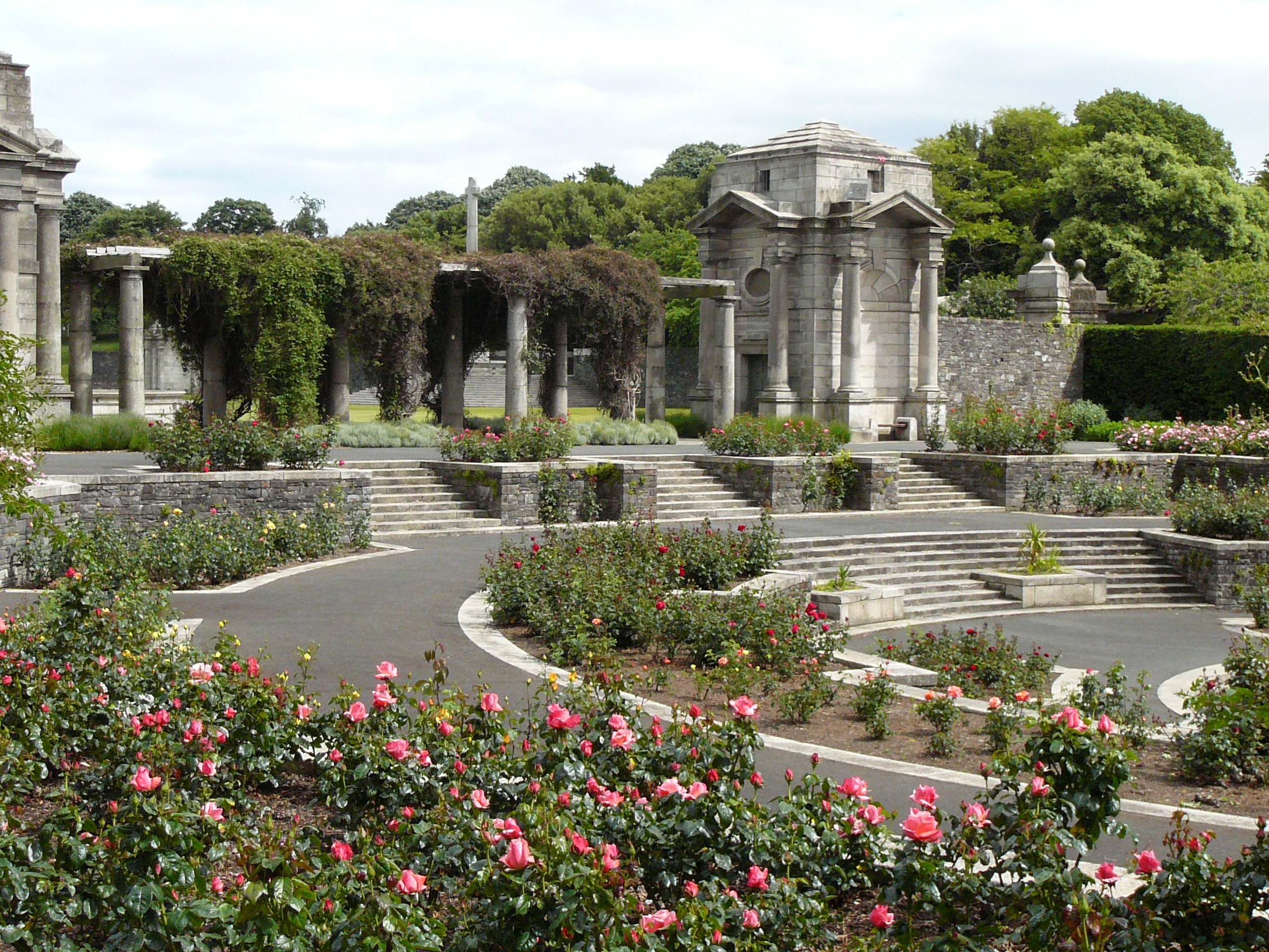 Description: Irish National War Memorial Gardens, Dublin, Ireland, left view setting of the circular Rose Gardens.