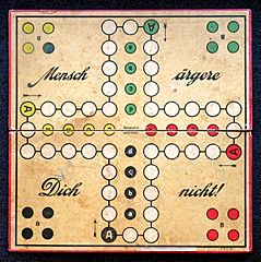 Description: Intensively used Plan of the German board game Mensch ärgere dich nicht (“Man, don't get annoyed”), edition of 1929 (front), Details.