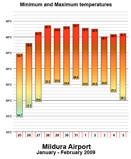 Description: A graph of the minimum and maximum temperatures recorded in Mildura, Victoria at the airport during the 2009 Southeastern Australia heat wave.