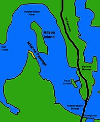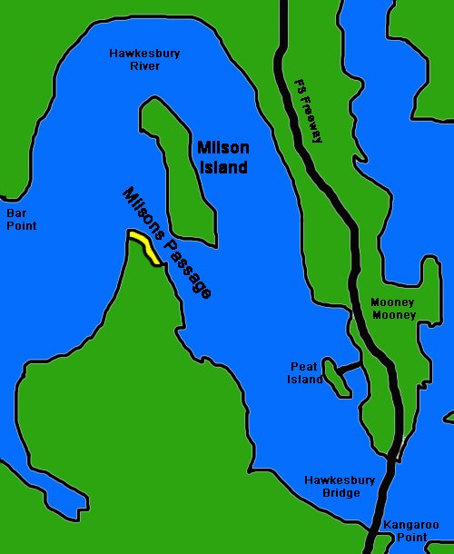 Description: Sketch map of Milsons Passage & Milson Island on the Hawkesbury River . The passage in the Hawkesbury River called Milsons Passage is marked on the map. Milson Island, only accessable by boat or ferry is marked on the map. The suburb by the name of Milsons Passage is marked on the map in yellow. The suburb is only accessable by boat.