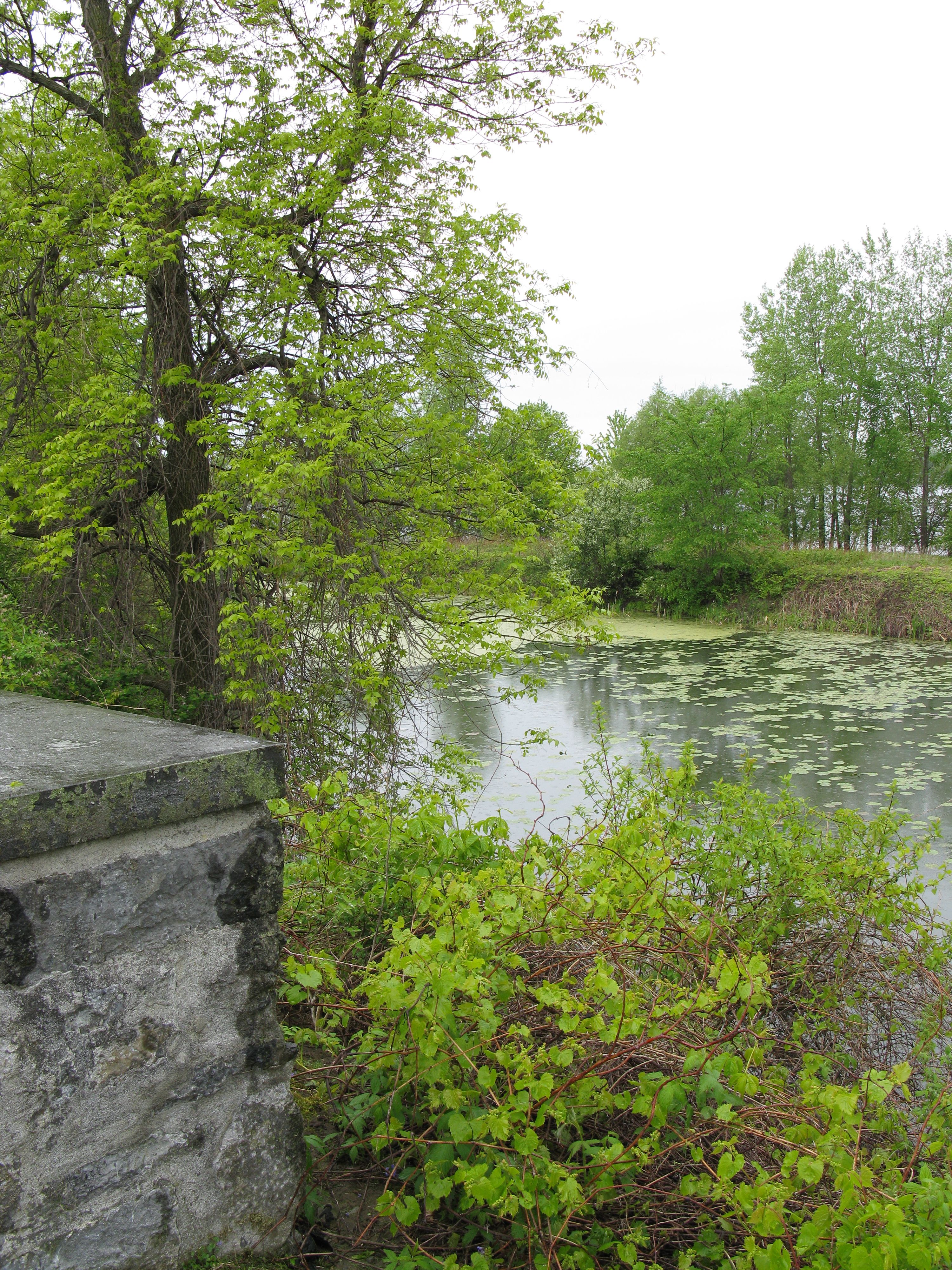Description: Moat around Fort Lennox. The structure to the left of the picture is the top of a chimney above a kitchen located in the casemate.