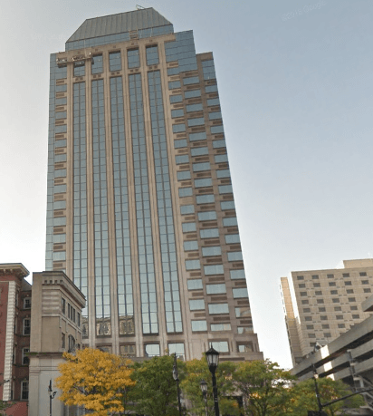 Description: Monarch Place, Springfield, Massachusetts. A blue and grey skyscraper with blue bands of vertical windows and a pitched roof on top.