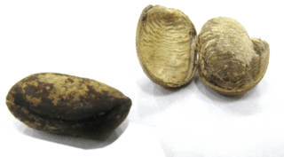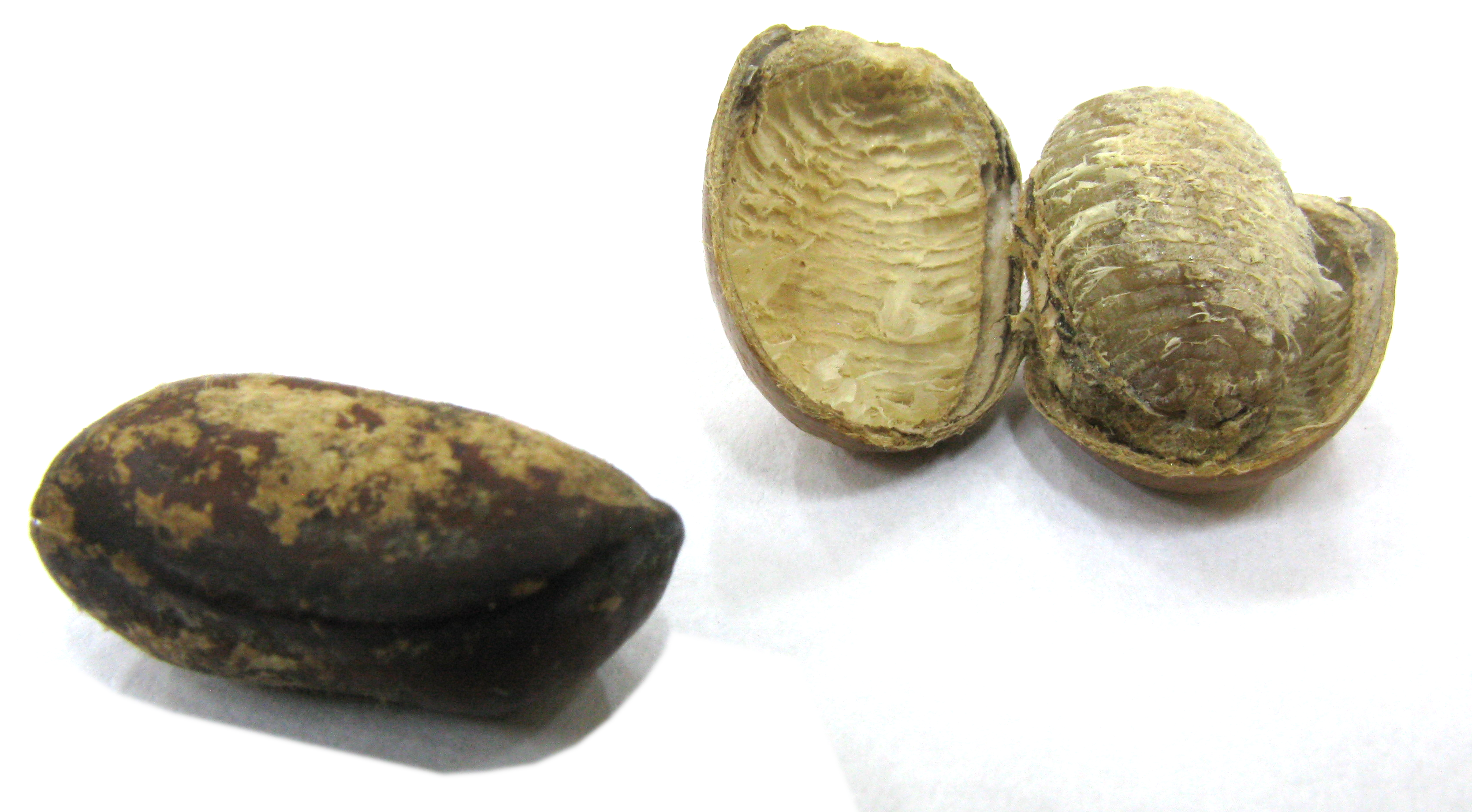 Description: Monodora myristica seeds, one still in shell, one opened.