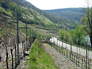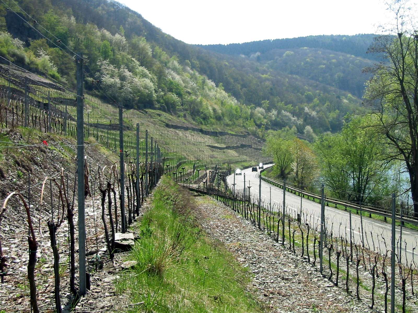Description: Rekultivierung einer alten Weinbergslage mit neuen Terrassen und quer verlaufende Bestockung an Spalierdrahtrahmen: Moselweisser Hamm, Untermosel