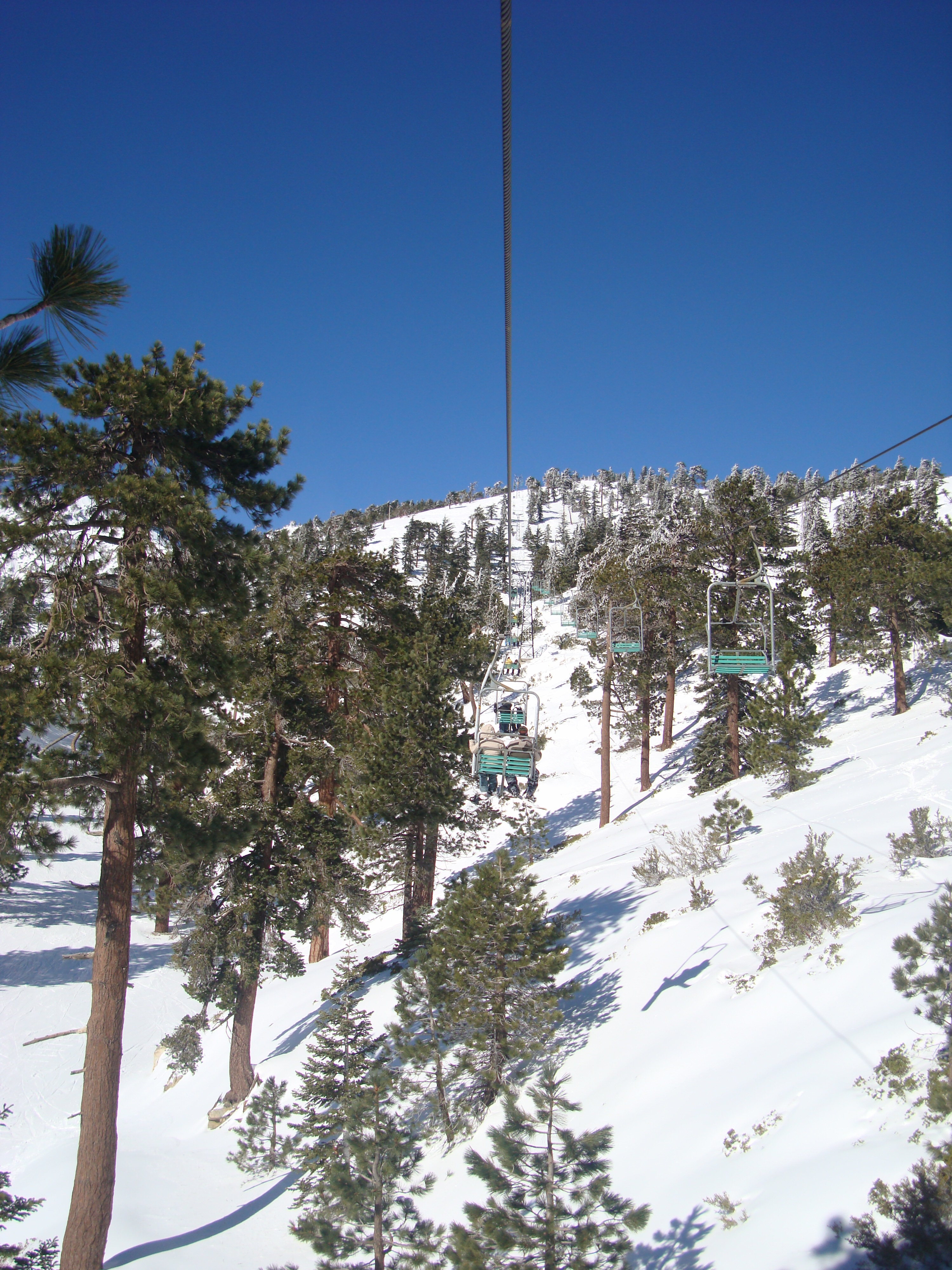 Description: A view from a chairlift at Mount Baldy Ski Lifts. At Mount Baldy in the San Gabriel Mountains, Angeles National Forest, Southern California.