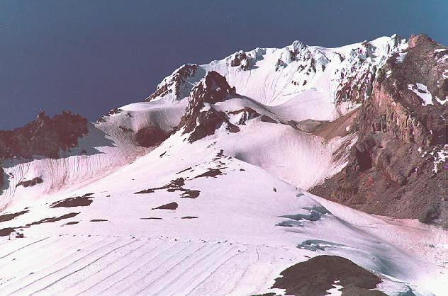 Description: I took this photo in June of 1991. It shows the summit ridge, crater rock and Palmer Glacier skiing tracks on Mt. Hood, Oregon