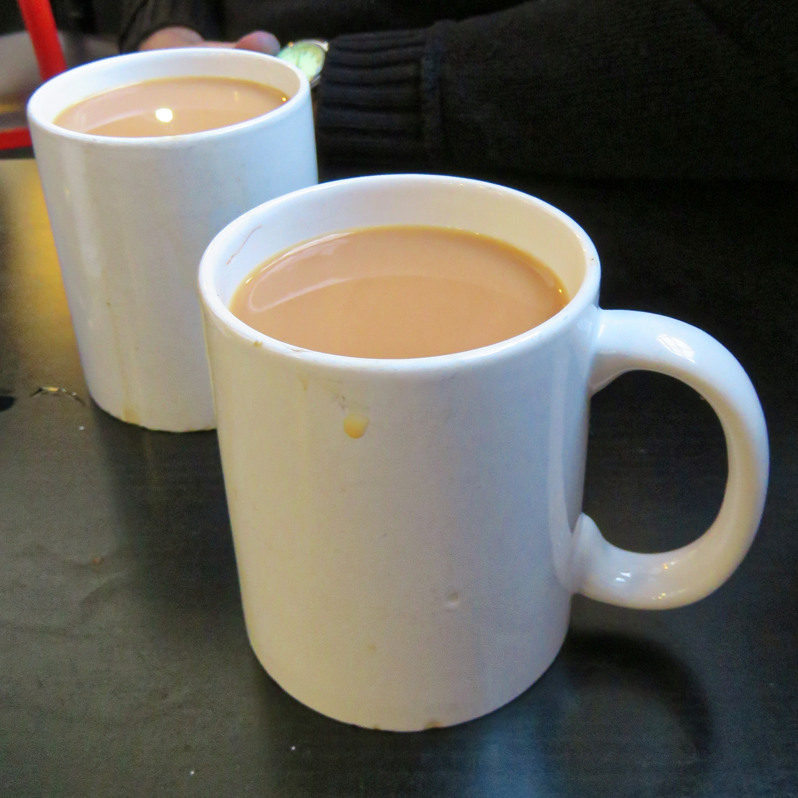 Description: Mugs of tea at Ferraris snack bar café, West Smithfield, in the City of London, England. Camera: Canon PowerShot SX60 HS. Software: file lens-corrected and optimized with DxO PhotoLab Elite and Viewpoint 3, and further optimized with Adobe Photoshop CS2.