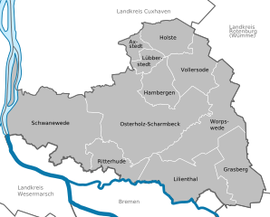 Credit: Own work This W3C-unspecified vector image was created with Adobe Illustrator. based on: File:Lower Saxony location map.svg, NordNordWest Niedersachsen Viewer Koordinierungsstelle GDI-NI beim Landesbetrieb Landesvermessung und Geobasisinformation Niedersachsen: DGM 5 Verfügbarkeit Landkreis/Stadt Landkreis Osterholz File:Locator map OHZ in Lower Saxony.svg, TUBS