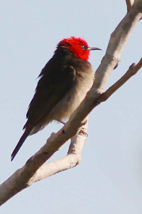 Description: Red-headed Honeyeater perched on a branch, rear view.