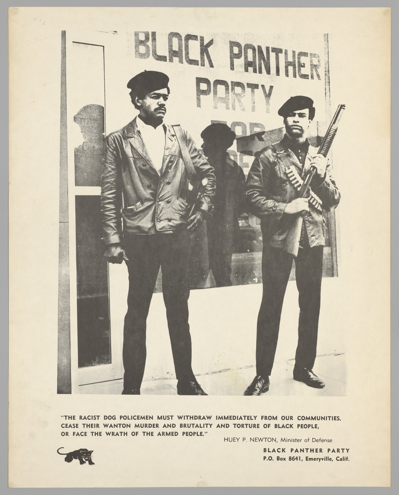 Description: Framed black and white poster of Huey Newton and Bobby Seale in front of the storefront headquarters of the Black Panther Party in Oakland, California. Both men are wearing berets and leather jackets and are armed with assault rifles. Below the image is this quote from Newton: "The racist dog policemen must withdraw immediately from our communities, cease their wanton murder and brutality and torture of black people, or face the wrath of the armed people".
