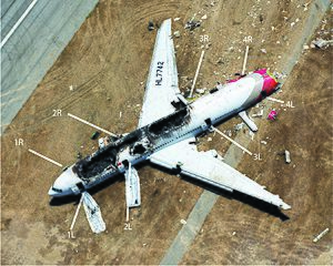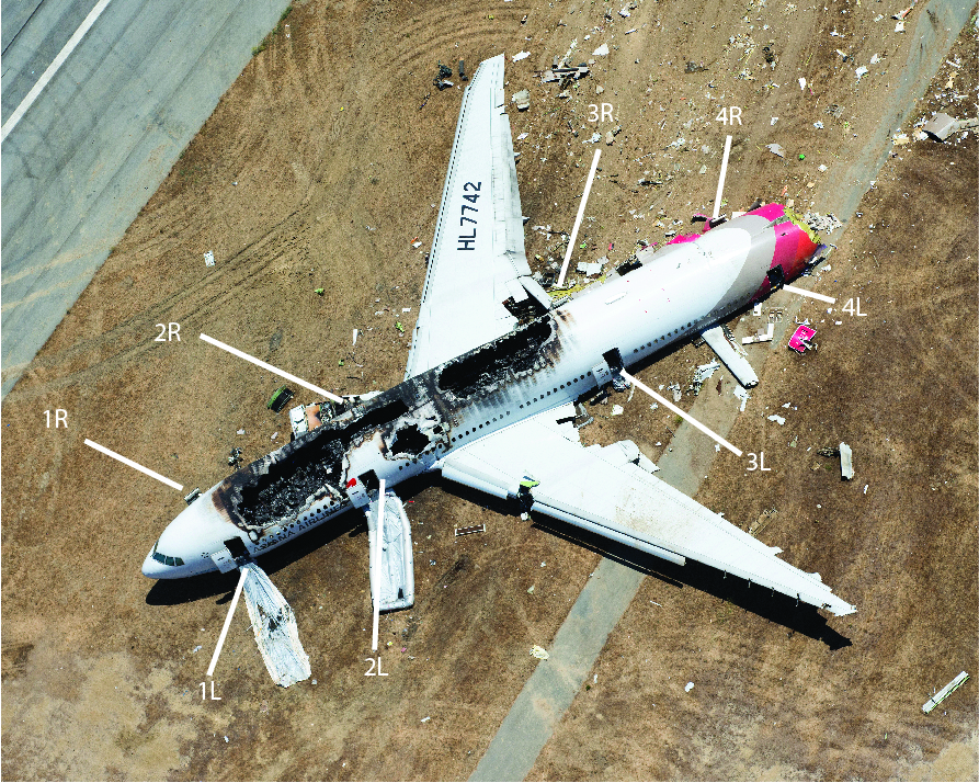 Description: Overhead view of Asiana Airlines Flight 214' post-accident at San Francisco International Airport (SFO). The location of exit doors are indicated on the photograph.