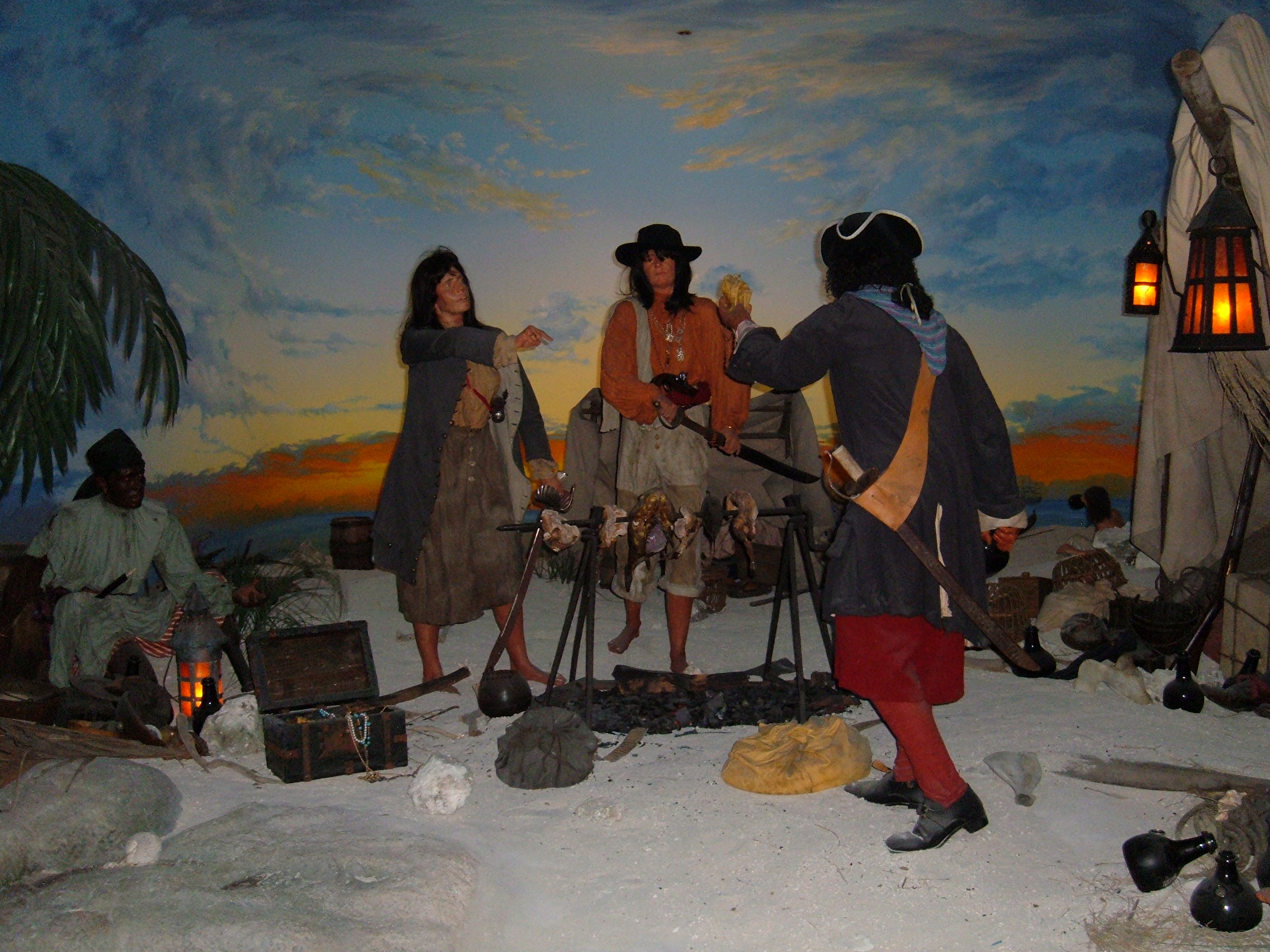 Description: A depiction of Nassau harbor on August 22, 1720 featuring the pirates Mary Read and Anne Bonney (both center) at the Pirates of Nassau museum in Nassau, The Bahamas.