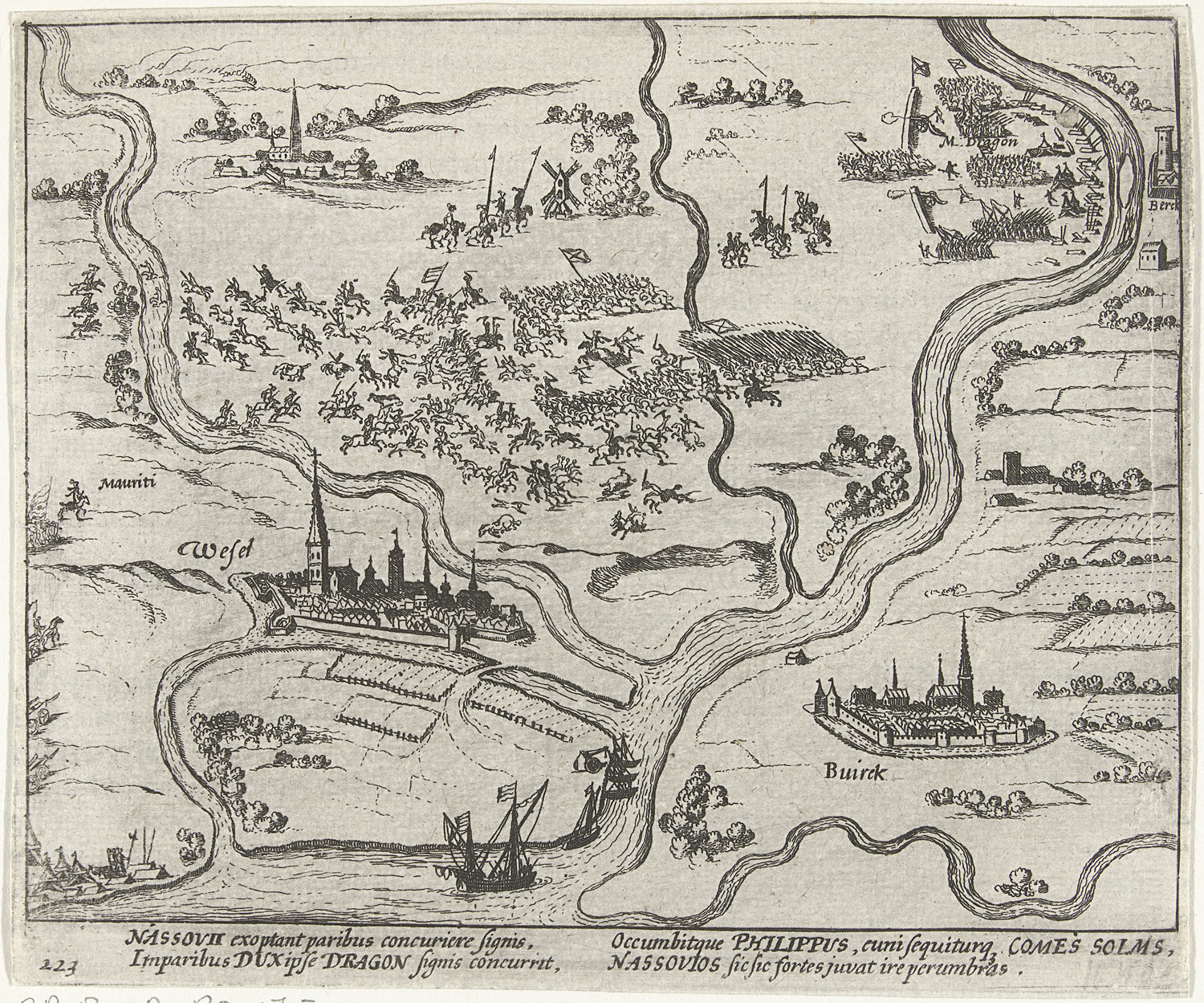 Description: Nederlaag van het Staatse leger bij Wesel. Ruiters van Maurits worden verslagen door de ruiters van Mondragon bij Wesel, 2 september 1595. Graaf van Solms en Filips van Nassau komen om het leven en graaf Ernst van Nassau wordt gevangen genomen. Onderaan Wesel, boven Rheinberg. Met onderschrift van 4 regels in het Latijn. Genummerd: 223. Bedrukt op achterzijde met tekst in het Latijn.