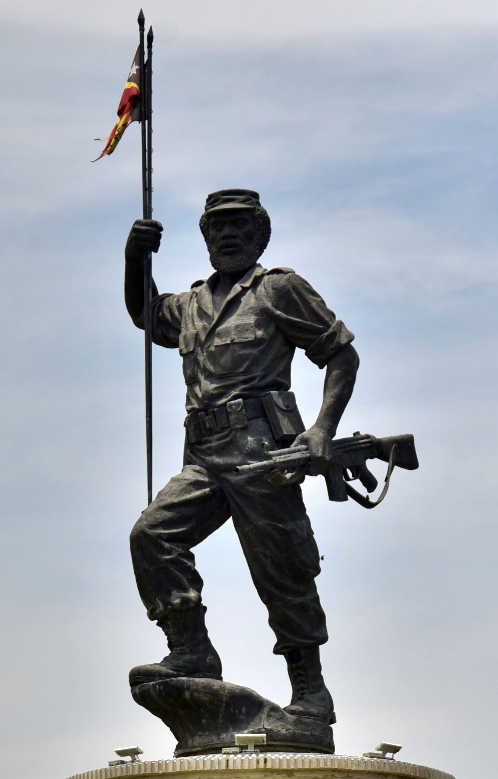 Description: View of the statue of Nicolau dos Reis Lobato inside the roundabout at the entrance to the Presidente Nicolau Lobato International Airport, Dili, East Timor