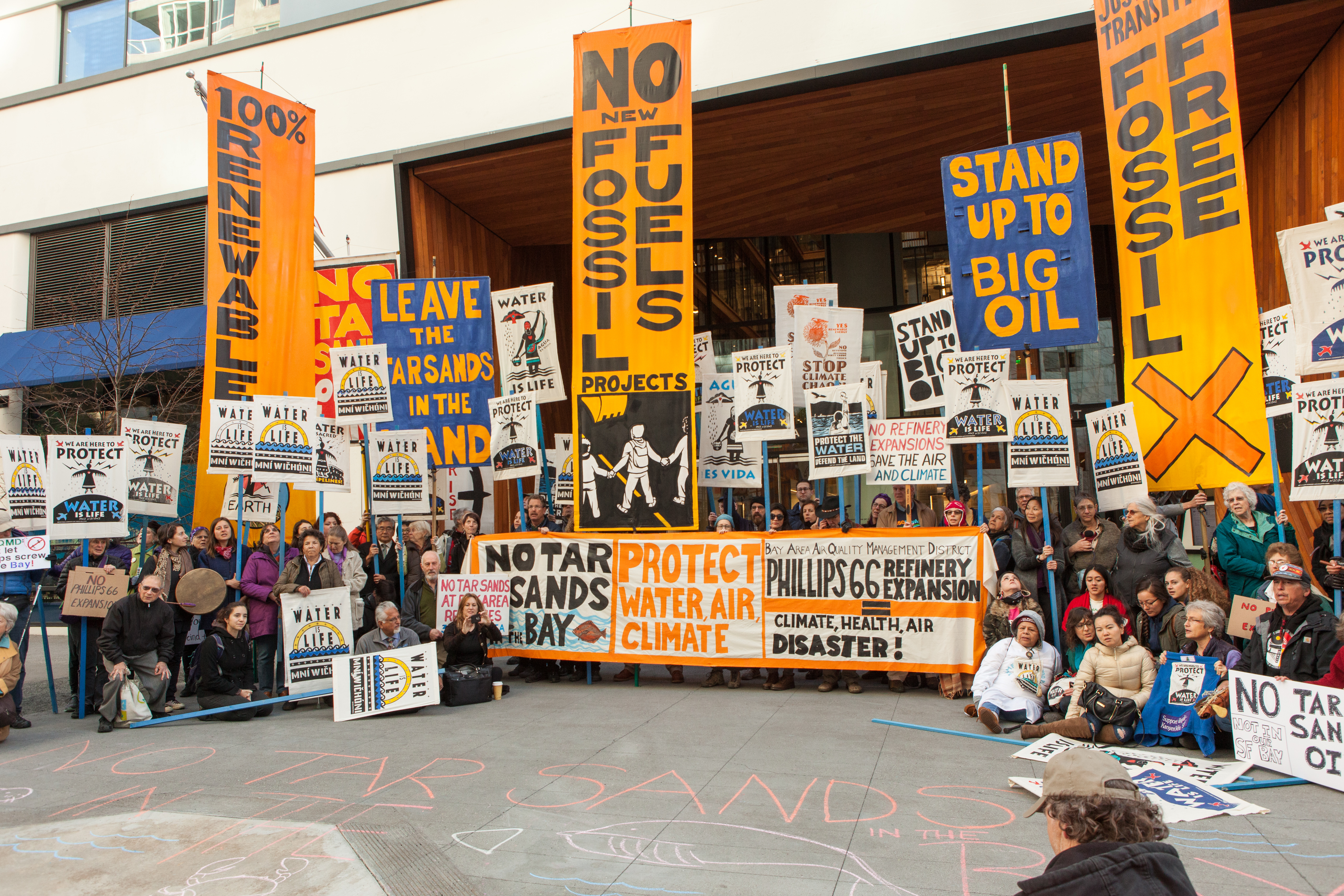 Description: Protesters hold signs and banners outside the Bay Area Air Quality Management District in San Francisco.