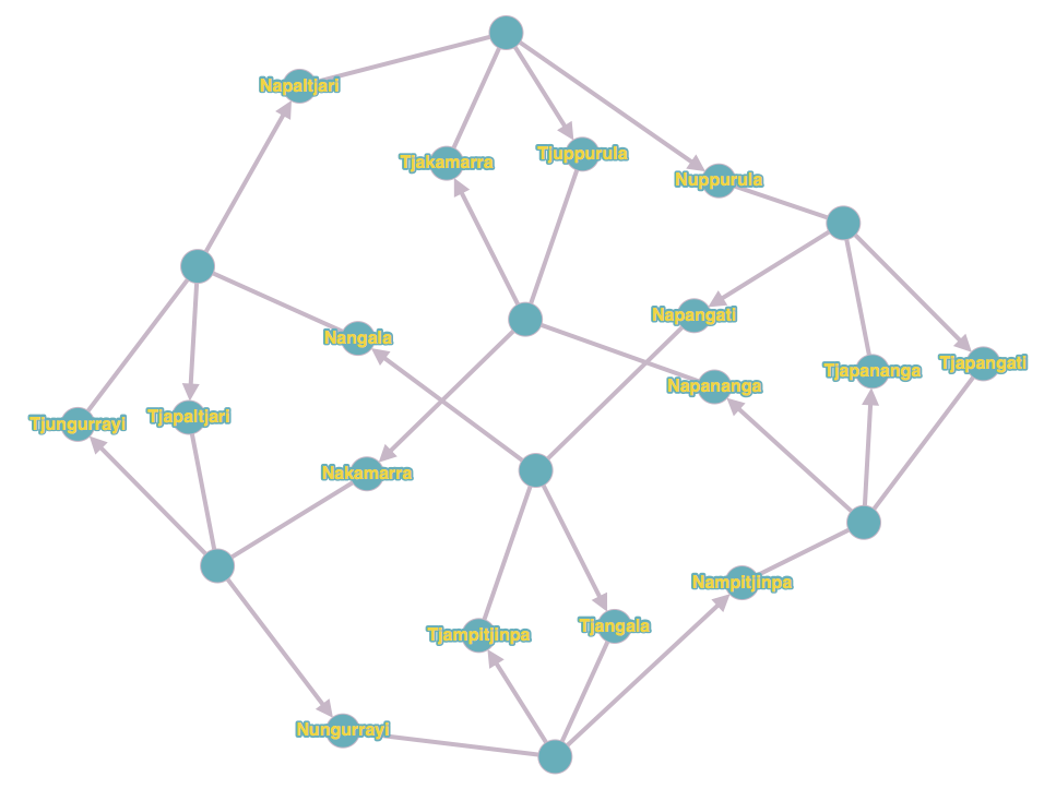 Description: Graph that sums up kinship among Warlpiri (Australian aboriginals). Unlabelled nodes stand for cast-allowed weddings. Resulting children casts are indicated by arrows. Graph available here : http://graphonline.ru/en/?graph=oxycDQWTZZpAgzMr