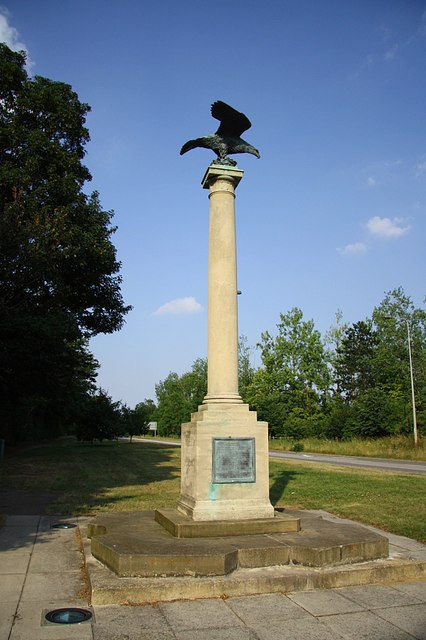 Description: Norman Cross Napoleonic Monument A replacement Imperial Eagle crowns the monument toppled in 1990 and the eagle stolen when it stood by Norman Cross roundabout, a few metres to the west on the Great North Road. Between 1793 and 1814 more than 30,000 French prisoners of war were incarcerated in the camp that stood in the adjacent field. On 28th July 1914, exactly 100 years after the closure of the camp, the original monument was erected as a memorial to the 1,770 men who died there. The replacement bronze eagle by sculptor John Doubleday was placed atop the re-sited column and re-dedicated by the 8th Duke of Wellington on 2nd April 2005.