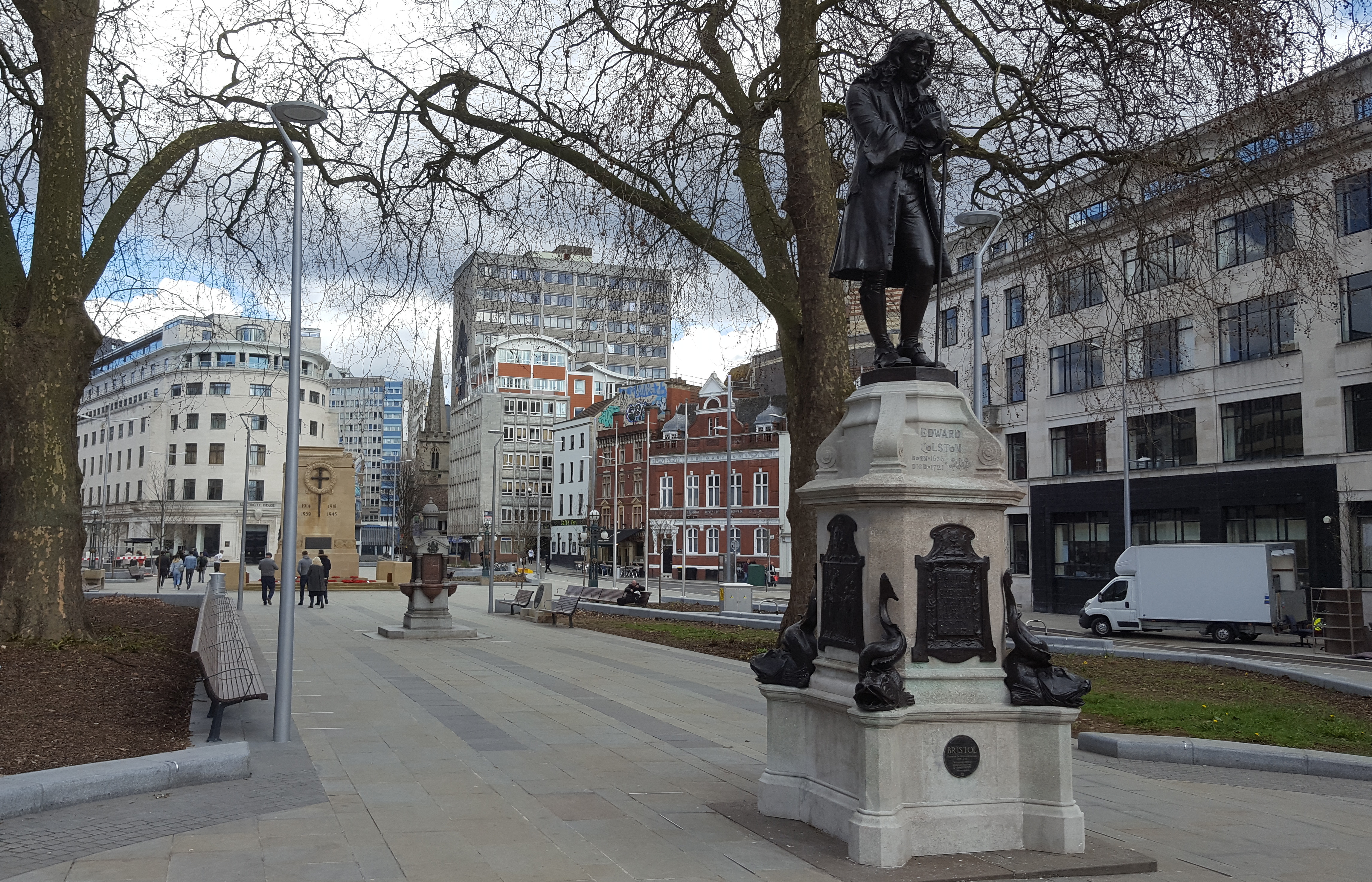 Description: Northern end of The Centre, Bristol, showing Cenotaph and statue of slave trader and local philanthropist Edward Colston following MetroBus-funded public realm improvements, March 2018.