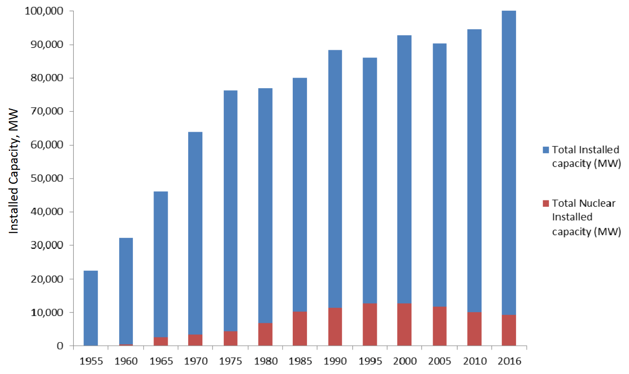 Description: Nuclear capacity as a proportion of total electricity generating capacity, 1955-2016.