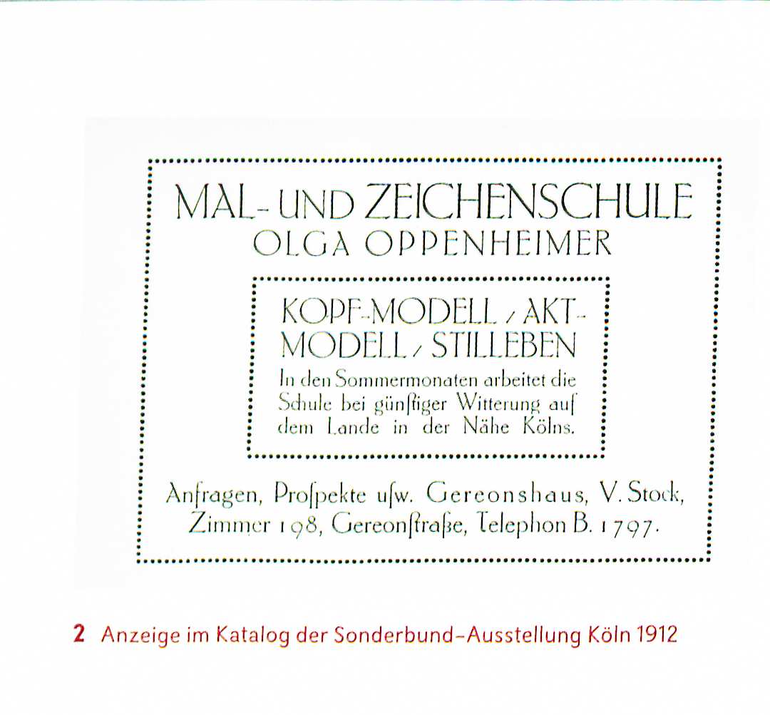 Description: Olga Oppenheimer Mal- und Zeichenschule. Anzeige im Katalog der Internationalen Kunstausstellung des Sonderbundes westdeutscher Kunstfreunde und Künstler 1912