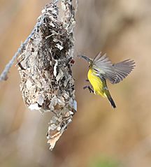 Description: Female of Olive-backed Sunbird (Cinnyris jugularis) at the nest. Wyvuri, North Queensland