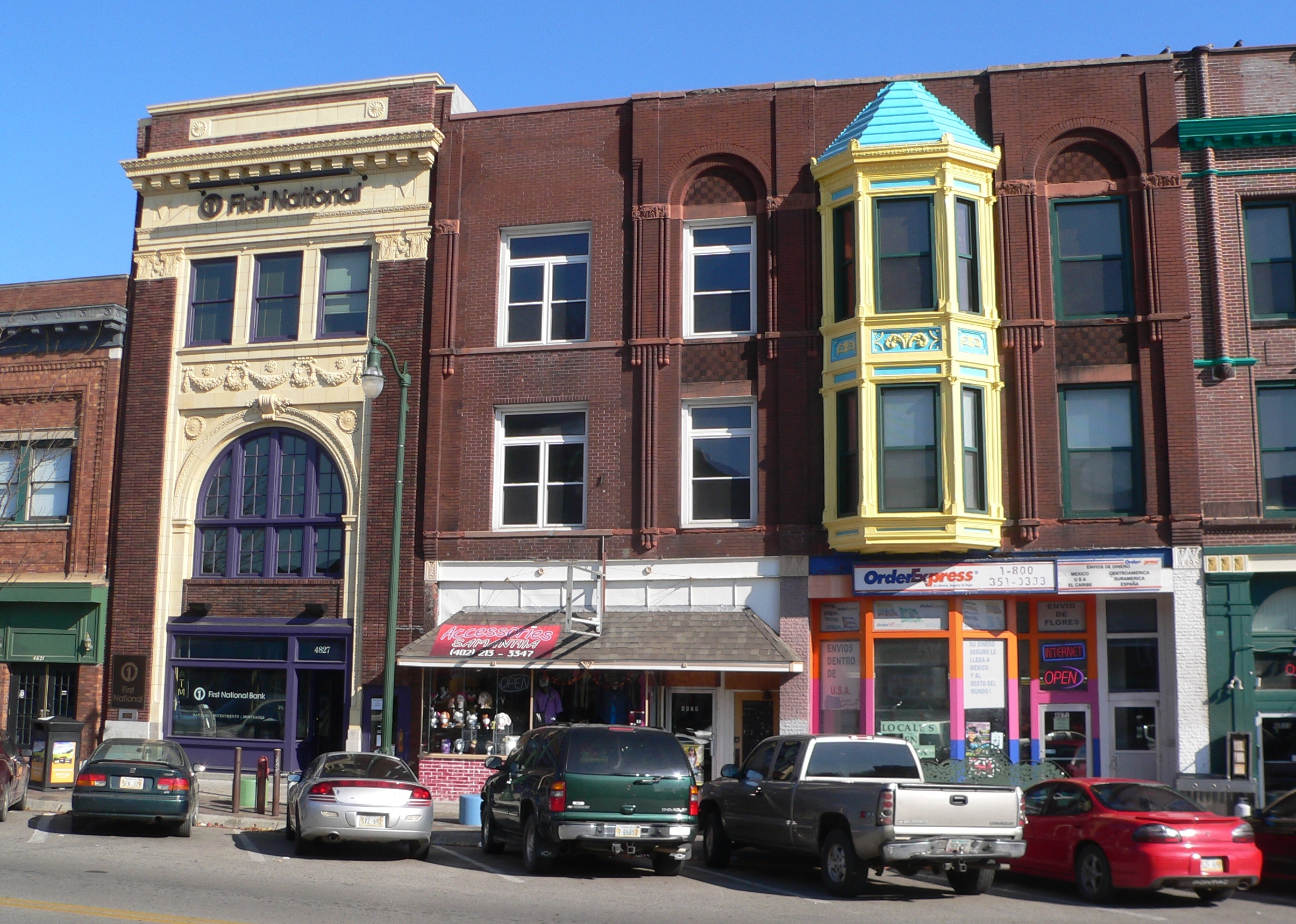 Description: Buildings on east side of 4800 block of South 24th Street in Omaha, Nebraska. At left is the Neneman's Bakery building at 4827 S. 24th, now occupied by First National Bank. At right is the Eggers Building at 4829-4831 S. 24th. Both buildings are contributing properties in the South Omaha Main Street Historic District.